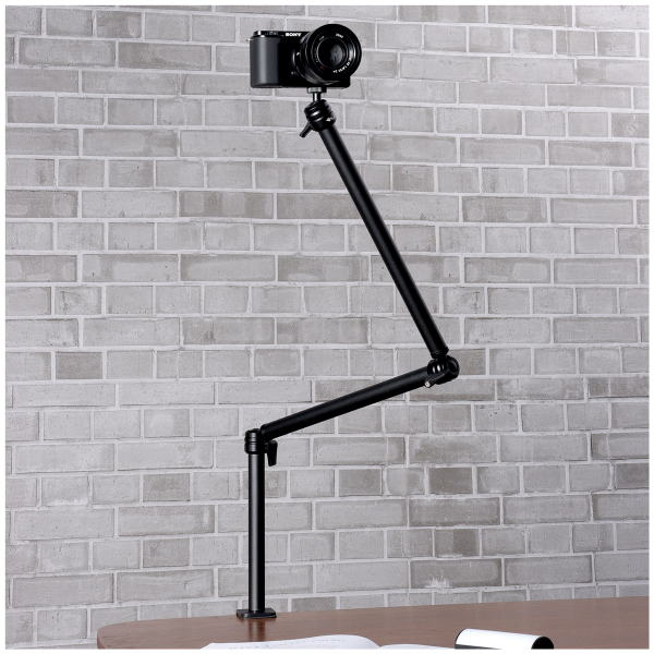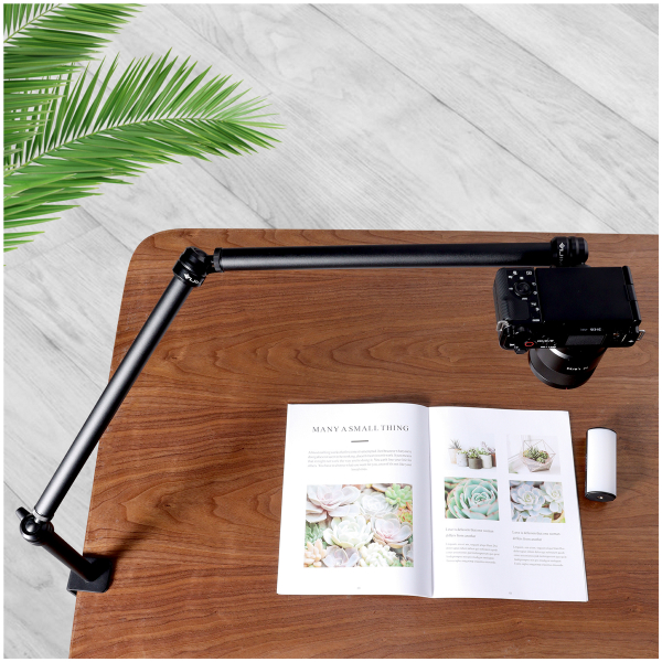 Vijim LS08 justerbar bordstativ til overheadkameraer er et bordstativ til f.eks. kameraer, mikrofoner og lyskilder. Den er tredelt og kan fastgøres til bordet eller andre stabile, lignende genstande. Det tredelte design gør det muligt at dreje hver arm 360°, hvilket giver fuld kontrol over dens position. De leddelte kugler, der holder armsektionerne sammen, kan låses i den lige position, så formen kommer til at ligne en selfie-pind. Alle tre dele har et 1/4''' gevind i enden, så du kan sætte så mange dele på, som du vil. I den anden ende af armstykkerne er der en tilsvarende skrue til forlængelse, men også til fastgørelse af kameraer osv. på bordstativet.
